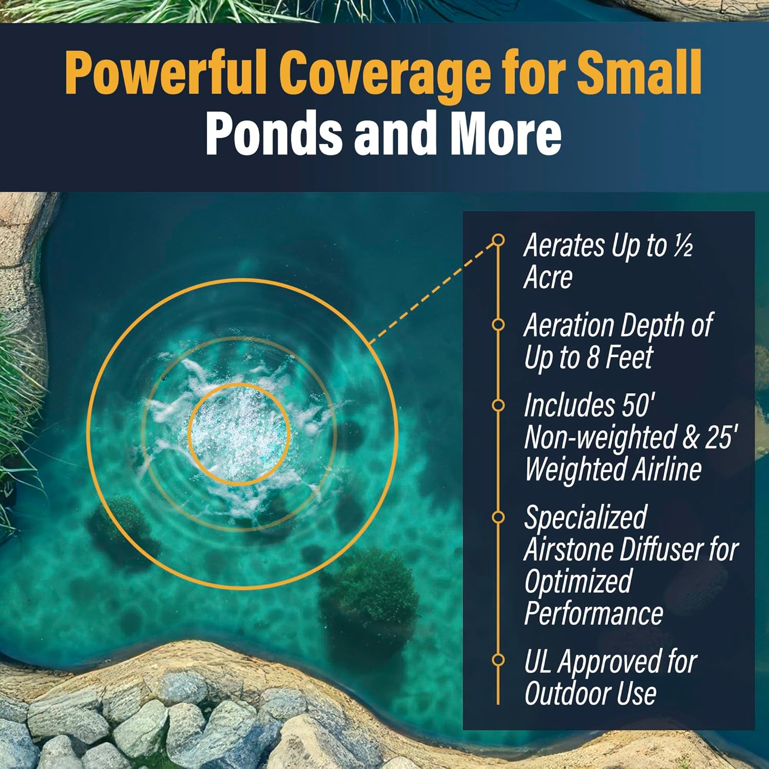 Electric aerator for ponds that are up to 8-feet deep and can aerate ponds up to 1/2 acre with a two-year manufacturer's warranty